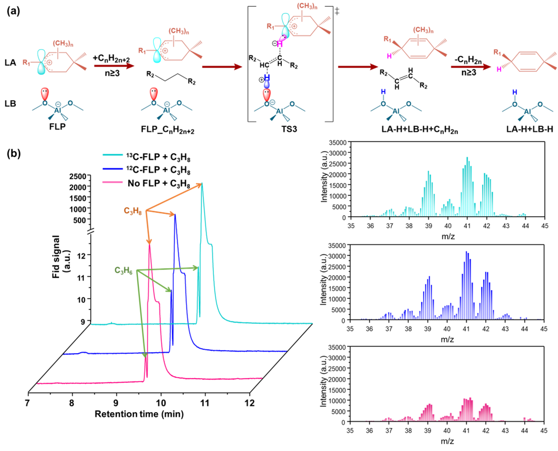 (a)烷烃FLP脱氢成烯烃的机理(b)丙烷在含FLP和无FLP的SAPO-34分子筛丙烷脱氢的GC-MS实验