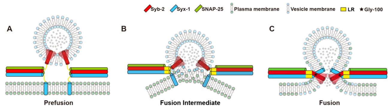 膜融合过程在生物体内的多种生理活动中普遍存在,大多数有效并可控的膜融合过程是由SNARE蛋白之间的协同作用所介导的。在神经元中,三个SNARE蛋白Synaptobrevin-2 (Syb-2),Syntaxin-1 (Syx-1)和SNAP-25组装成SNARE复合体,驱动突触囊泡和质膜融合以释放神经递质。尽管前人在SNARE复合体结构和功能的研究方面均取得了重大进展,但是SNARE复合体在膜融合过程中的组装机制仍然存在诸多争议。其中争议较大的是SNARE所介导的膜融合过程是否需要SNARE复合体从N端不断组装到跨膜区域的C末端。