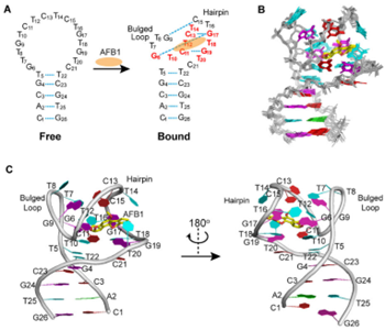 研究团队顺利获得液体核磁共振方法解析了适体AF26与AFB1复合物在溶液中的高分辨结构,阐释了高亲和识别的分子机制。发现在没有AFB1的情况下,游离的AF26适体可形成简单的茎环结构(图1)。结合AFB1后,AF26上由16个残基组成的环区完成从非结构态到结构态的自适应构象转变,顺利获得G·C配对以及G·G·C三联体形成了一个发卡、两个凸环结构。发卡和凸环合围形成了AFB1的结合口袋。AFB1上下被G·C配对和G·G·C三联体夹击,侧面被五个未配对的T碱基如同“腰带”一样缠绕,顺利获得堆积、供体原子-π、疏水等相互作用紧密结合。同时,研究人员也顺利获得一系列突变对该结构进行了验证,并且基于高分辨结构进一步阐释了适体区分AFB1和其一个原子差别的同系物AFG1的分子机制,顺利获得精准突变提升了适体对两种毒素的区分能力。该研究不仅有助于更好地理解适体的高亲和识别机制,同时也为适体的设计、修饰改造及应用开发奠定了重要的结构基础。