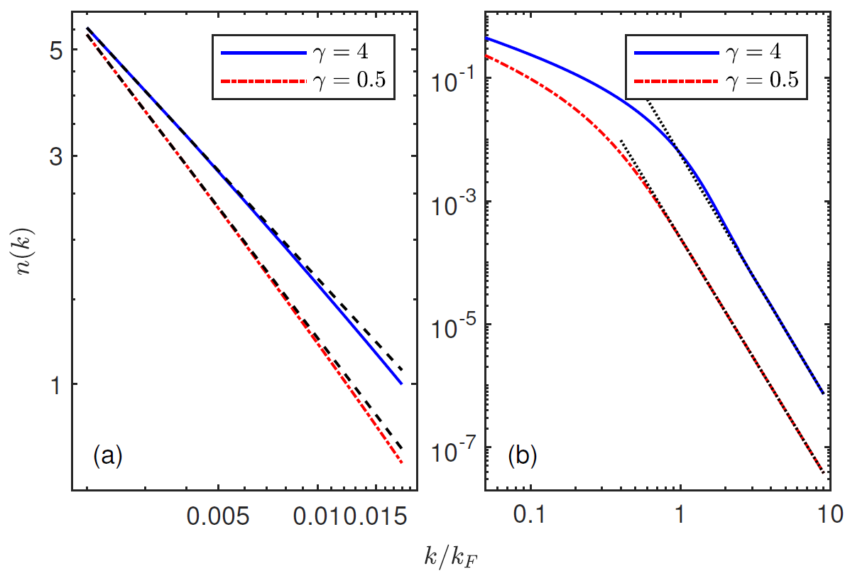 动量分布,(a) 小动量区,n(k) ∝ kα。黑色虚线显示拟合斜率α为-0.750 (γ=4.0)和-0.908 (γ=0.5),符合线性Luttinger液体理论预言-0.737和-0.894;