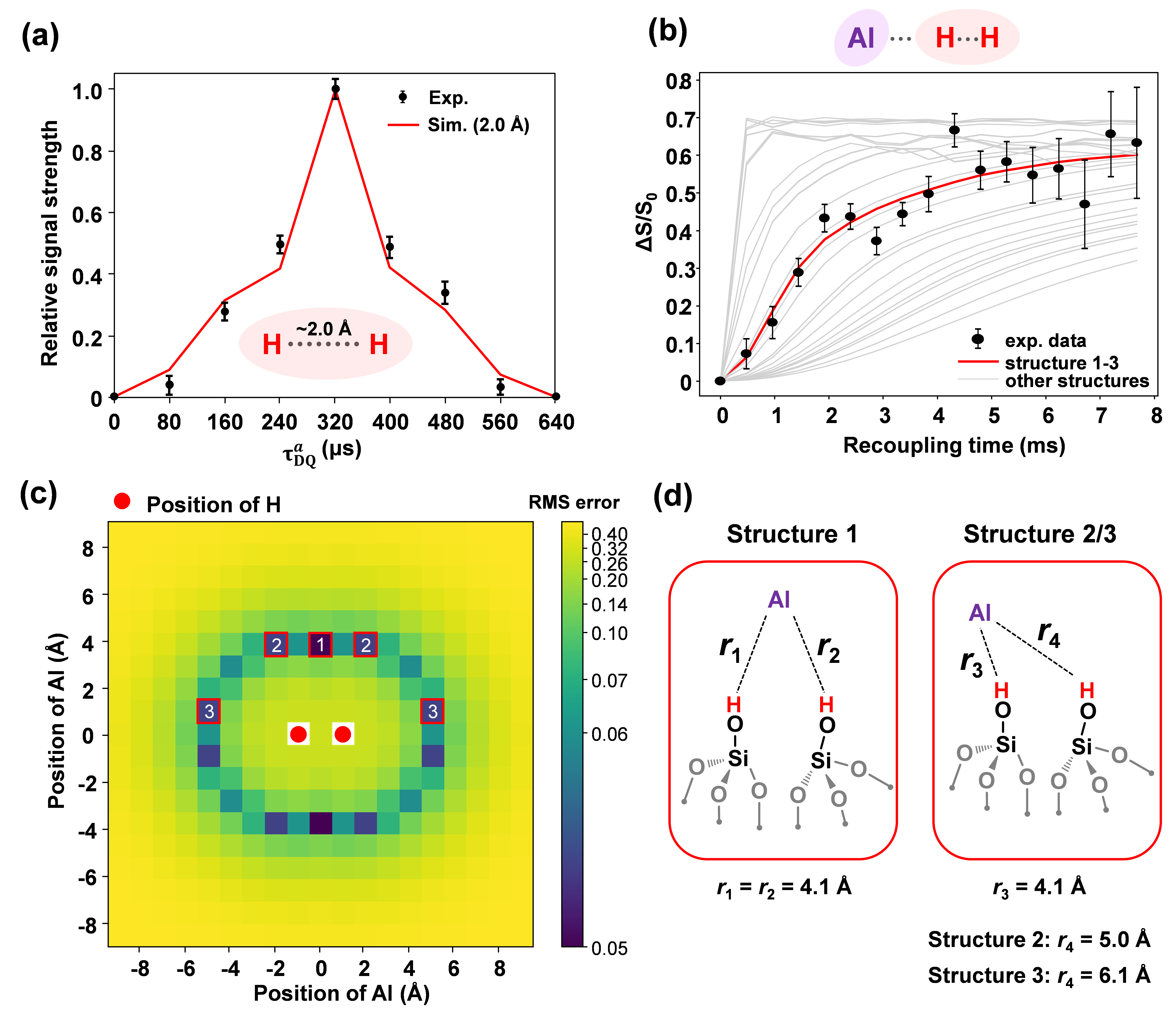 图2.  经水热处理的无定形氧化硅-氧化铝中“伪桥式羟基对”的核间距离测量;(a) 恒时演化1H-1H f-DQ/SQ 实验及拟合;(b) 1H-{27Al} S-RESPDOR实验及拟合; (c) 1H-{27Al} S-RESPDOR 实验数据与自旋动力学模拟结果的均方根误差;(d) 根据 NMR/DFT 结果提出的两种最可能的伪桥式羟基对结构模型