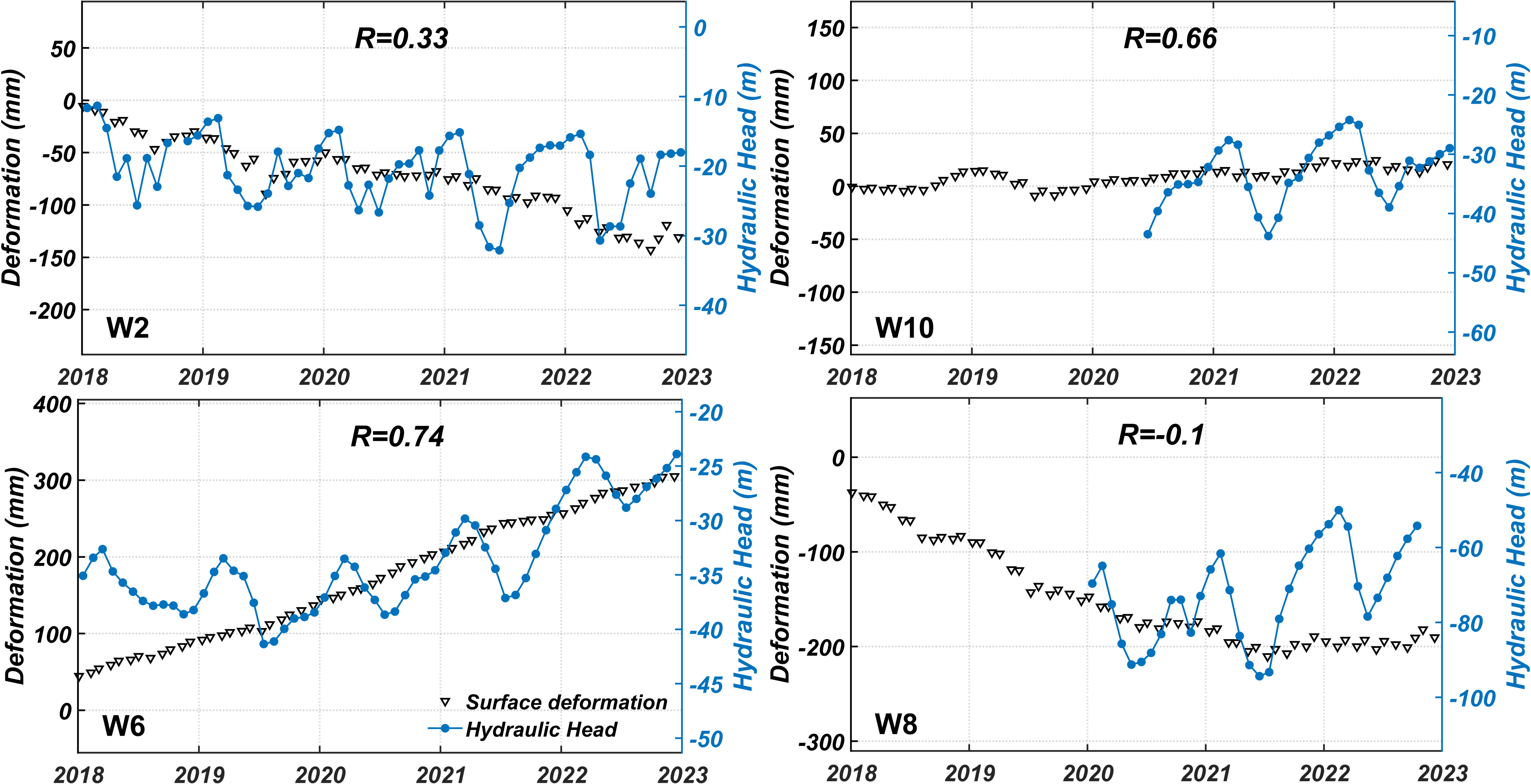 研究发现,衡水市的地面沉降表现出两类典型特征(图二):第一类为沉降速率与地下水位动态变化呈显著同步性,指示其沉降主控因素为承压含水系统的水位下降;第二类则显示出地下水位回升背景下沉降持续开展的异常现象,经分析主要归因于弱透水层因前期水位下降引发的滞后排水效应。研究进一步揭示,衡水市地处黄河冲积平原与冲积扇过渡带的特殊地质环境,沉积物在岩性组成和结构特征上存在显著空间异质性。这种地质背景导致区域含水层系统在储水能力和渗透性能方面表现出强烈的非均质性,从而形成了地面沉降空间分布的不均衡格局。