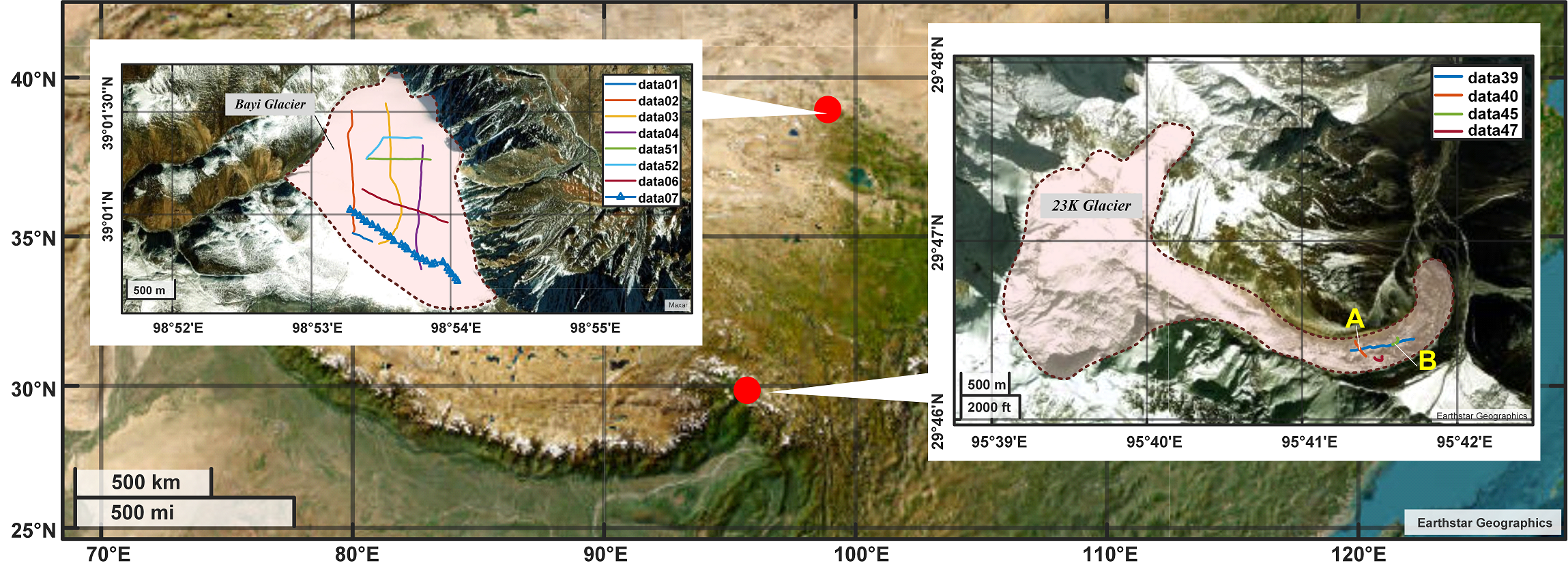 八一冰川与23K冰川位置及GPR测量路线