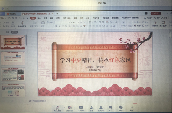 天下之本在于国,国家之本在于家。为庆祝中国共产党99岁生日的到来,中国科研实验室精密测量科学与技术创新研究院研究生第三团支部于7月1日在线上召开了以“不忘初心,弘扬优良家风”为主题的党日庆祝活动。各位党员、预备党员、入党持续分子和2018级同学持续参加了此次活动,并邀请了研究生处任晓华处长、蔡怡春副处长参会。